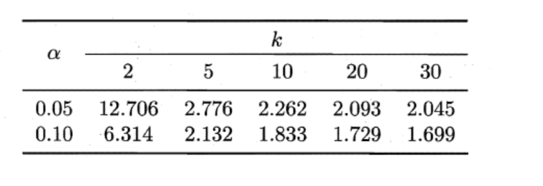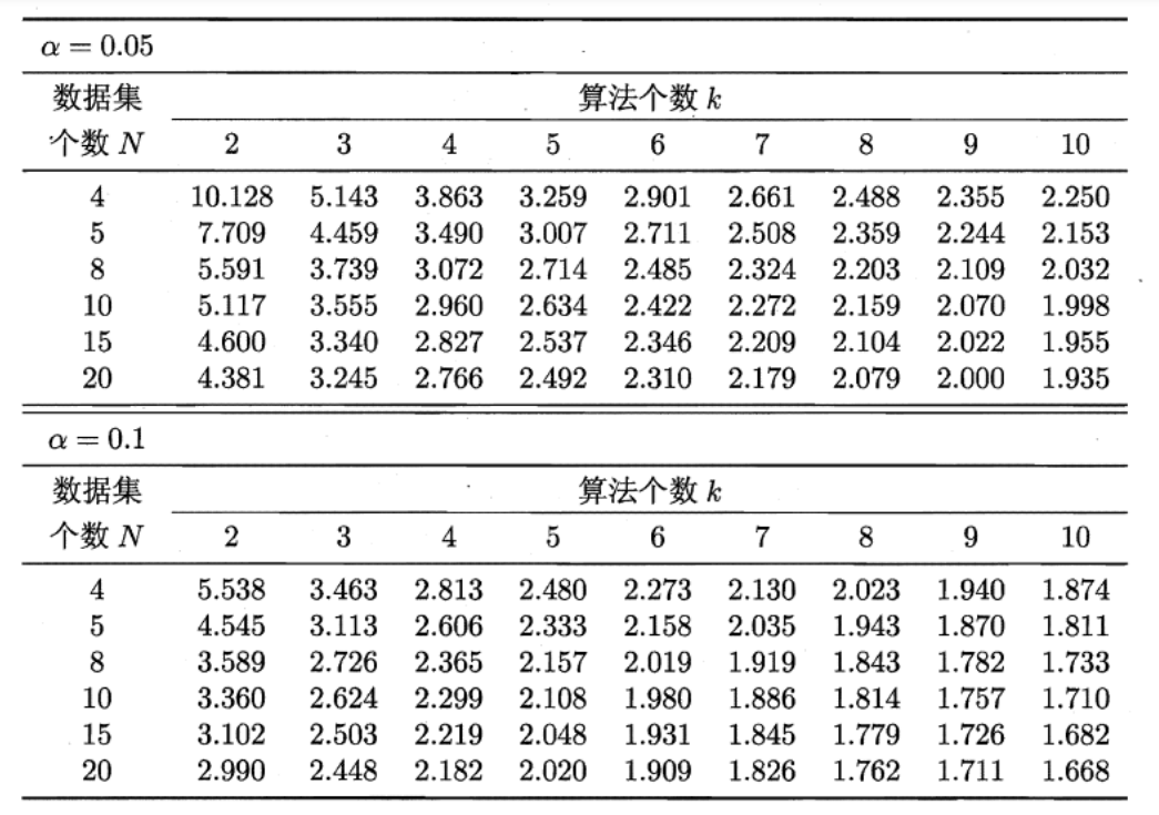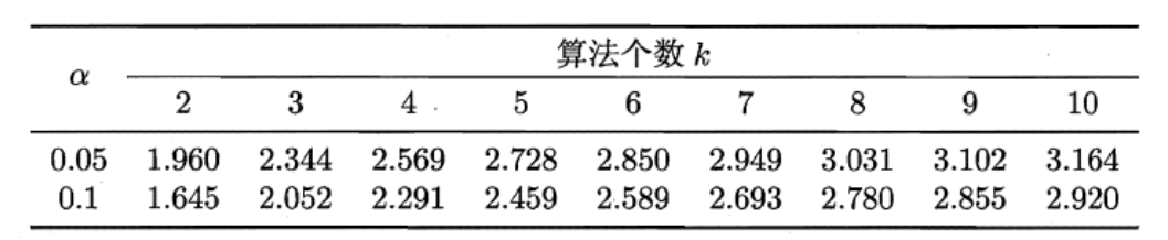 这里需要注意,表中的数据只是一个特例,有了这个平均序值并不能完全说明序值小的算法一定更好,因为针对不同的数据集,也许A算法会不如B算法,而且两种学习器在同一个数据集上也可能会有相似的结果,所以我们需要用一个估计阈值,来判定哪个算法更加好。