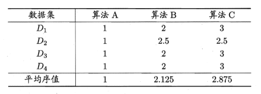 F检验法的基本思想是在同一组数据集上,根据测试结果对学习器的性能进行排序,赋予序值1,2,3…,相同则平分序值,如下图所示: